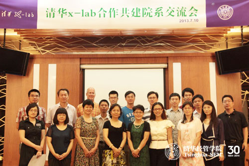 清华x-lab合作共建院系交流会于2013年7月10日下午在紫光国际交流中心举办。清华经管学院副院长高建教授、x-lab主任张帏教授、副主任Steven White、x-lab执行主任毛东辉、执行副主任黄瓅向来自材料学院、环境学院、信息科学技术学院、美术学院、理学院等学院的10位负责合作共建的对接老师介绍了x-lab成立两个月来的进展情况,并就如何合作共建x-lab、合作共建的机制和内容确定等事宜进行了深入探讨。x-lab平台的项目学生代表也参加了交流会,共同探讨如何在x-lab实现资源配置需求。