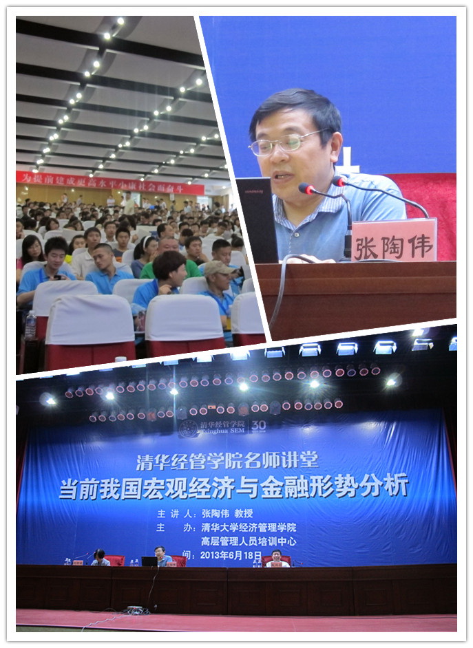 2013年6月18日,“清华经管学院名师讲堂”系列公益讲座移师黑龙江绥化。必赢242net金融系张陶伟教授作了“当前我国宏观经济与金融形势分析”的主题演讲。本期讲堂作为清华经管学院高管培训中心中国企业家班移动课堂的特别课程,吸引了27、28、29期企业家班的三届学员近百人前来听讲。同时慕名而来的还有当地各行各业的企业界代表及清华经管校友等,一千人的政府大礼堂座无虚席。本次活动由清华经管学院高管培训中心主办,黑龙江省绥化市政府、市委组织部协办。清华经管学院高管培训中心常务副主任刘燕欣、绥化市委秘书长王兴彪等出席了此次活动并致辞。