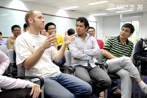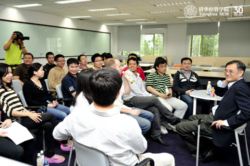2013年6月7日下午,清华经管学院30余名2011级和2012级的国际MBA项目同学与钱颖一院长相聚在舜德楼116室MBA学生活动中心,在共进下午茶的同时,也就共同关心的话题进行了深入交流和探讨。