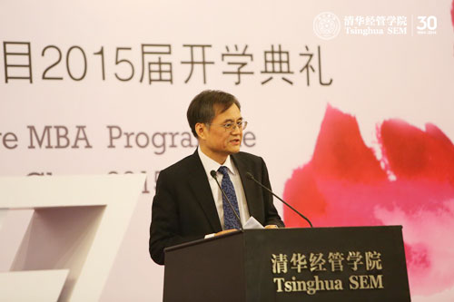 INSEAD代理院长Peter Zemsky随后也发表致辞。他首先代表INSEAD对第七届入学的TIEMBA同学表示欢迎。随后他向大家介绍了INSEAD的发展历史:尽管相比美国老牌商学院,成立于1957年的INSEAD是一个相对年轻的独立商学院,但是它在起源之时就定位于为欧洲而非仅仅立足法国。经过多年发展,现在的INSEAD已经发展扩展到全世界范围——在全球拥有了法国枫丹白露,阿联酋阿布扎比,新加坡三个校区和一流的师资力量。Peter Zemsky教授介绍到,世界对中国经济的高速发展深感振奋,深化对中国的认识与了解已经成为各国公司必须面对的课题,INSEAD与清华经管学院合作的TIEMBA项目融合了两所顶尖商学院的智慧,历届招收的学生来自不同的行业,不同的国家。他寄语同学们保持开放的心态,拥抱体验文化多样性的魅力。