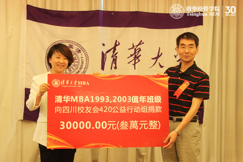 清华MBA校友会副秘书长晨红雨(MBA2006)主持了公益捐赠仪式,校友理事冯珂代表四川校友会公益小组对前期开展的420震后公益行以及藏区助学活动进行了专题汇报。公益小组在震后第一时间走进灾区,物质救助和精神支持并重,组织校友发起募捐,已经筹款27.5万元。2013年值年筹委会负责人陈灵芝(MBA2003)代表1993级、2003级12个班级的值年校友集体捐款3万元,用于芦山、宝兴灾区的学生,并委托MBA四川校友会持续开展助学活动。李瑞潮学长代表四川校友组织接受捐赠。大家共同发出倡议,每个MBA校友都做一份公益奉献,我们的社会将更加温暖。