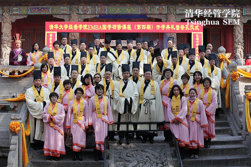 3月14日上午,同学们来到曲阜孔庙,身着传统汉服,在孔庙祭司的主持下参加祭拜孔子仪式暨国学班(第四期)开学典礼。清华EMBA教育中心执行主任王勇,副主任孙美琦,国学班(第四期)班级主管惠心,以及“儒”模块特邀授课教师美国维吉尼亚大学讲座教授陈明哲、台湾大学教授孙中兴一同参加了祭孔仪式及开学典礼。