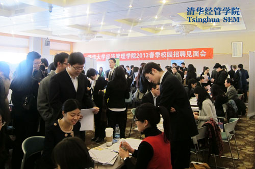 2013年3月28日,由清华经管学院职业发展中心(CDC)主办的“2013年春季校园招聘见面会”在舜德楼418举行。来自金融、咨询、制造、TMT、医药等行业的近40家优秀企业的人力资源和业务负责人到场,带来两百多个京内和京外实习和全职岗位,共四百多个工作机会。招聘会吸引了420多名经管学院本科、硕士、博士和MBA学生到场参加。