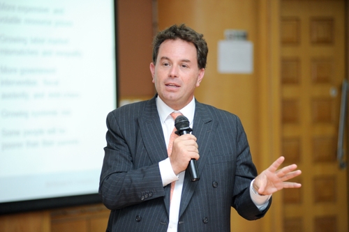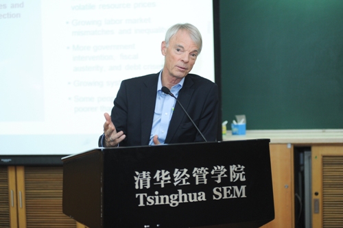斯宾塞教授对2010年至2030年经济增长出现的一些新趋势进行了分析和展望,包括对中国即将面对的“中等收入陷阱”问题、世界投资环境的结构性变化、由城市化进程与社会老龄化问题带来的资本价格不可避免的增加等。随后他还指出,自然资源需求的快速变动会导致资源价格的大幅波动与上升,同时由于商品价格与石油等自然资源价格之间的相关性越来越高,会导致物价的大幅变动。此外,根据麦肯锡全球研究院的调查,劳动力市场供需的不平衡问题也日趋明显,中国正面临高能力劳动者缺乏、低能力劳动者过剩的问题。
