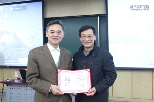 会计专业硕士项目主任罗玫教授致开幕词后,清华经管学院副院长夏冬林教授对潘晓江博士的经历和学术研究领域进行了介绍:早在八十年代初,潘博士就开始翻译介绍国际会计准则,对国际会计准则的了解非常深入和透彻,是国内最早研究国际会计准则的专家之一;其次,潘博士对会计理论的研究有非常独到之处,他从历史和哲学角度来研究会计问题,哲学是学问当中的学问,而用哲学去研究会计问题是对会计理论本身的深刻理解。随后,夏冬林教授为潘博士颁发了242net官网会计专业硕士资深校友导师的聘书。