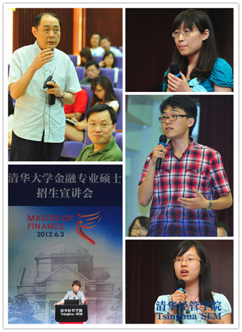 在答疑环节中,现场的学生纷纷踊跃提问,问题涉及到金融专业硕士夏令营报名事宜、国际交换、奖学金、授课语言、报考资格、录取原则、就业等各方面。郦金梁教授和康以同教授针对同学们提出的问题进行了详尽的解答。康以同指出,五道口金融学院今年不招收金融学硕士,计划招收金融专业硕士100名。郦金梁表示,在金融夏令营和全国统考中,报考清华金融专业硕士都是一个项目统一入口,选报分班。考生在进入金融夏令营后,选报就读班级(经管学院北京班、经管学院深圳班、五道口金融学院班)。(供稿 金融硕士项目办公室 编辑 沟通办)