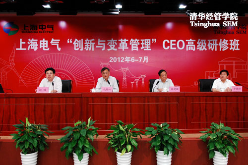 2012年6月7日-9日,清华经管学院高级管理培训中心受上海电气集团股份有限公司委托,为其总公司及下属单位的相关领导、职能部门负责人开设了“创新与变革管理CEO高级研修班”。上海电气(集团)总公司党委书记、董事长徐建国,清华经管学院院长钱颖一教授、高级管理培训中心主任薛镭教授共同出席了开学仪式并作了讲话。