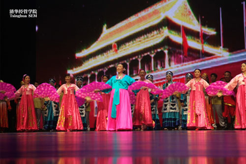 晚会的第一篇章《缘起》在舞蹈《东方红》选段中结束。这个节目的所有表演人员都是清华EMBA学生,舞台上声情并茂的表演瞬间引发了舞台下激情澎湃的回应,最后,身着各民族盛装的演员齐聚舞台,一首嘹亮而深情的《歌唱祖国》献给大家,有的同学甚至激动得站起来鼓掌。