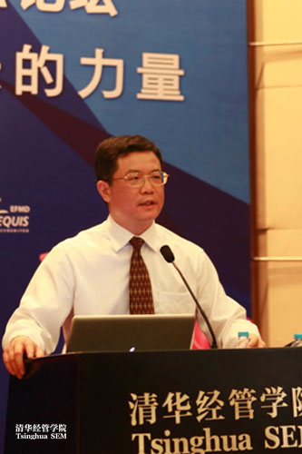 清华经管学院院长钱颖一教授致辞,他提到,经过十年,清华EMBA已经成为中国最具综合实力、最具口碑人气、最具影响力的EMBA项目。清华EMBA一直以培养产业领袖塑造企业未来为使命,十年来,清华EMBA形成了五大优势:强大敬业的师资阵容,广泛而雄厚的国际合作资源,精致的课程设计,严明的教学管理以及充满凝聚力的校友网络,这些优势已经成为清华EMBA品牌和声望的集成。同时,他还表示,清华EMBA具有三大特点: