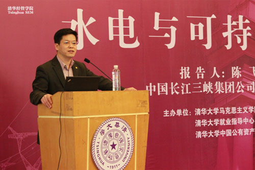 陈飞总经理演讲的题目是“水电与可持续发展”。陈飞从“水电是经济社会可持续发展的重要支撑”、“水电是能源可持续发展的基石”和“三峡工程”等三个方面发表了演讲,并对中国长江三峡集团公司做了简单的介绍。经管学院校友、科技日报理论部主任胡钰博士和马克思主义学院朱安东副教授也畅谈了自己的感想与感受。胡钰指出,通过陈飞总经理的报告,加深了对国家的认识、对国企的认识、对国有企业管理者的认识。朱安东谈到,陈飞总经理的报告,树立了新时期、新世纪的负责任、有实力的国企新形象。在回答同学提问的过程中,陈飞希望清华的学生在工作中“不抱怨、不放弃”,终能取得优秀的工作成绩。最后,教师和学生代表向陈飞总经理赠送了首讲纪念牌和活动纪念海报。
