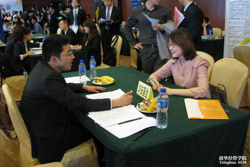 2012年4月12日,由清华经管学院职业发展中心(CDC)主办的“清华经管学院2012春季招聘见面会”在文津酒店举行。来自金融、零售、奢侈品、医疗服务、制造业、能源和TMT等行业的27家知名雇主积极参会,包括中信产业基金、中银投资、华安基金、谷歌、微软、爱默生、沃尔玛、新奥和红珏高级时装等,带来了针对经管学院本科、硕士和MBA学生的近两百个实习和全职岗位。共有近400名经管学院学生到场参加。本次招聘会的参会雇主整体质量明显提升。同时,学生关注度高和活动整体策划严谨、服务周到也是本次招聘会的新亮点。