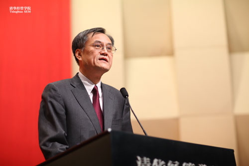 钱颖一院长代表学院欢迎同学们加入清华大家庭,成为清华新百年的新学子。他说,“从2002年清华经管学院首批获准开办EMBA学位教育以来,清华EMBA教育走过了十年。十年是一个里程碑,也是一个新起点,你们既是站在清华新百年的开局之初,也是站在清华EMBA新十年的新起点上。回首过去的十年,清华EMBA一共培养了2677 位毕业生,他们现在都是各行各业的中流砥柱和产业进步的领军者。”钱院长阐述了对清华EMBA使命的理解,“培养产业领袖”,指不仅要搞好一个企业,还要引导一个产业;“塑造企业未来”,不仅要搞好企业的今天,还要考虑企业的未来。钱院长引用苹果公司和IBM公司的案例,强调“远见引导产业,思考成就未来”,这正是清华EMBA教育目标的实现路径。他希望各位同学来清华学习,不仅要学习知识、开发人脉,更重要的是增加远见,更好的思考,成为有远见的思考者。