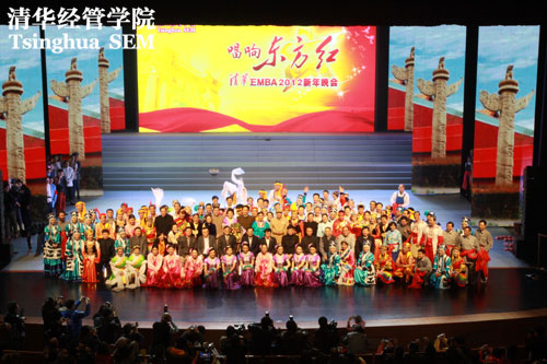 清华EMBA新年晚会以“唱响东方红”为主题,在引人回顾祖国历史的同时,也勾起了对清华百年历史和EMBA教育10年历程的回顾与遐想,对于国运社稷关注承担的历史使命感和责任感也始终贯穿其中。 晚会最后,EMBA全场演员与校院领导合影留念,为此次演出划上了圆满的句点,也记录下了这令人难忘的夜晚。