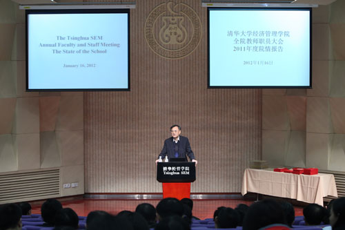 2012年1月16日下午,清华经管学院在伟伦楼国际报告厅召开全院教师职员2011年度大会。学院全体教职员工400余人参加了会议。大会由学院党委书记杨斌教授主持。