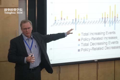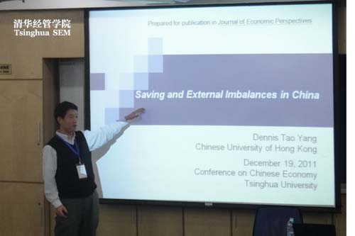 在为期两天的会议中,共有十六位与会学者宣讲了他们关于中国经济问题研究的论文。讨论的主要议题包括中国的劳动力市场,企业进出口,居民消费储蓄,银行借贷和利率双轨制,公共治理结构和产业政策等。会议邀请了来自美国芝加哥大学布斯商学院的Steven Davis教授和宾夕法尼亚大学的方汉明教授做了大会主题发言。Davis教授的报告主要是关于政策风险的研究以及失业的福利分析。方汉明教授就健康保险改革和劳动力市场的关系阐述了他的最新研究成果。另外,此次会议还举行了针对中国经济增长和内外部平衡问题的政策讨论。Davis教授阐述了当下中国经济增长的面临的外部风险。他认为一个经济体是有可能保持长期增长的,比如美国在100多年时间内保持2%~3%的成长速度。但也应当看到,也有国家,比如日本,在增长了一段时间之后又经历了长期的萧条。来自香港中文大学的杨涛探讨了中国内外部失衡问题,即居高不下的储蓄率和经常项目盈余,指出了可能的原因和解决方案。清华经管学院特聘教授朱晓冬就中国的经济增长问题认为尽管人口红利、后发者红利在不断减小,但鉴于中国经济中存在的各种扭曲和资源的错配,如果能矫正这些扭曲,中国的经济增长还是有很多潜力。