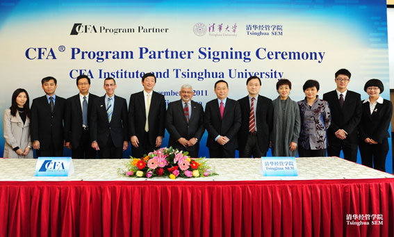 在当日下午举行的合作签字仪式上,学院党委副书记焦捷教授和CFA协会理事Charles Yang 先生分别致辞。焦捷教授和CFA协会亚太区董事总经理艾博科博士代表双方签署合作协议。CFA协会副理事长Alan Meder 先生、理事Aaron Low博士和理事邵征女士及清华经管学院2011级金融专业硕士学生代表参加了签字仪式。