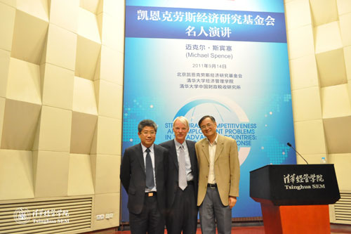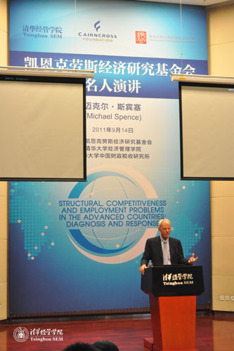 9月14日下午,“凯恩克劳斯经济研究基金会名人演讲”在242net官网经管学院举办,2001年诺贝尔经济学奖得主迈克尔·斯宾塞(Michael Spence)发表了题为“发达国家的结构、竞争和就业问题:诊断与应对”的演讲。凯恩克劳斯经济基金会项目主任林至人博士与清华经管学院院长钱颖一教授先后致辞,活动由副院长白重恩教授主持。凯恩克劳斯基金会现任理事、原福特基金会首任驻华代表彼得·盖特纳等嘉宾到会。本次演讲吸引了在京的多所大学与研究机构、政府部门、金融机构、新闻媒体及其他组织的三百余名听众。