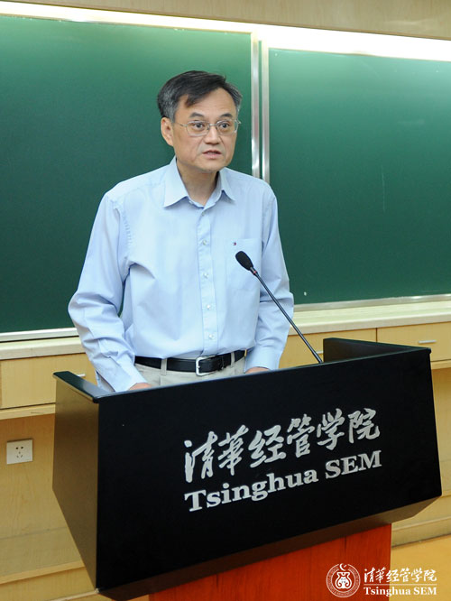 清华经管学院院长钱颖一教授代表学院致欢迎辞。他指出在国际政治经济金融形势动荡而多变的当下,迎来中投公司高级管理人员培训班,对深化中投公司与清华经管学院的合作具有重要意义。高级管理培训中心对此次中投公司的定制课程相当重视,由杨斌教授担任责任教授,全面负责培训课程的设计以及师资安排。课程内容涵盖“宏观把握”、“业务精进”和“文化整合”三个模块,主要涉及“中国与全球经济”、“金融与风险管控”、“领导与组织文化”等内容,邀请了近二十位学院优秀教授和业界专家共同授课。