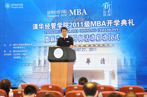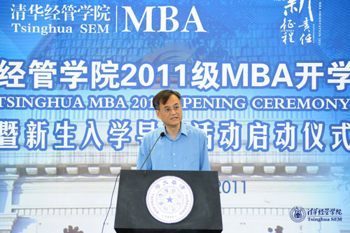 开学典礼由清华经管学院院长助理高建教授主持。清华经管学院院长钱颖一教授首先致辞,他热烈欢迎2011级的同学加入清华MBA大家庭,并在讲话中谈到,清华MBA至少在以下三个方面在中国MBA教育中发挥了引领作用: