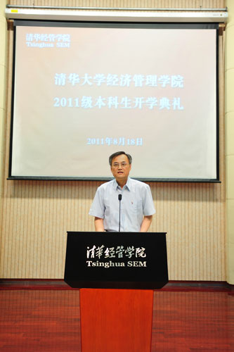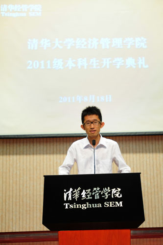 开学典礼由副院长白重恩教授主持。现任学生会主席、经83班学生杨奇函首先代表老生致辞。他回顾了三年前初入清华经管学院的欢欣,发现身边“都是全中国最优秀的学子”,“每一个人都有一段传奇”。也正因为此,“才真正的相信,过去的成绩真正成为了过去。”他鼓励新生们在清华经管学院这样一个“充满选择机会”、“能够让优秀人才脱颖而出”的环境中,锐意进取,“选择清华的选择”。他满怀激情地呼吁:“四年之后,我们是谁,我们在哪,我们在干什么,都取决于我们现在的选择,而我们恰恰可以选择!”