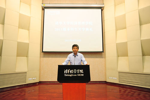 钱院长说,2011级同学是清华新百年的第一届本科生。同时还将见证2014年学院的三十年院庆。他期望同学们在学习方法上能实现转变和提升,从“解题”转向“读书”,并且通过“读书”而深入“思考”。最后,钱院长以“祝同学们的大学时代成为你们今后一生的新起点”作为致辞结语。