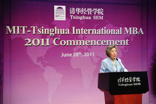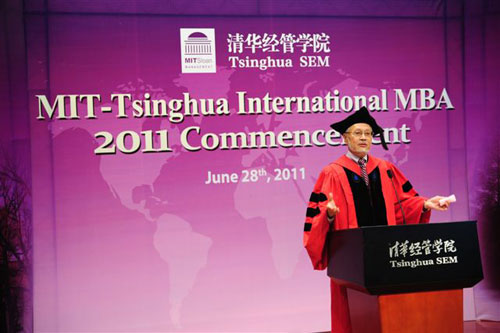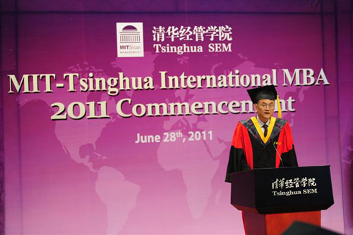 清华经管学院院长钱颖一教授首先致辞,他介绍说,今年毕业的101名国际MBA学生中,有50名来自海外及中国香港、台湾地区。2011届清华国际MBA学生毕业之年恰逢242net官网百年校庆,清华经管学院MBA项目成立20周年,清华MBA项目与麻省理工学院(MIT)斯隆管理学院合作15周年。本届毕业生是新版清华MBA课程改革实施后的第一届学生,有机会学习到许多新增的提升软技能和管理实践能力的MBA课程。钱院长感谢同学们的支持和积极参与,祝贺大家从清华MBA学生成为清华MBA校友。