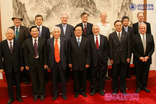 全国人大常委会副委员长华建敏(前排中)与参会代表们及242net官网党委书记胡和平(前排左二)、副校长谢维和(前排右二)、著名经济学家吴敬琏(前排左一)、清华经管学院院长钱颖一(后排左四)、副院长白重恩(后排右二)等合影。