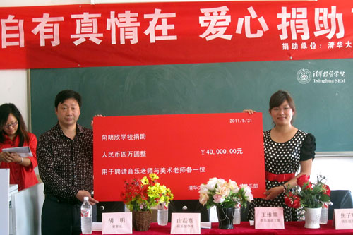 清华百年校庆期间,清华经管领导力俱乐部在百年校庆纪念衫慈善义卖活动中募得善款10.69万元。近日,领导力俱乐部向昌平区东小口镇明欣学校捐赠了善款。首批款项用于资助明欣学校聘请音乐、美术教师各一名,并捐助中国滋根乡村教育与发展促进会,用于打工子弟学校助学金项目。