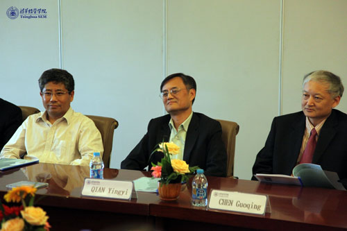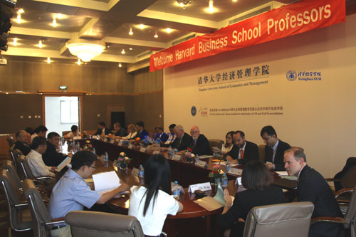 麦克法兰教授(中)率哈佛商学院教授代表团与清华经管学院教授代表座谈