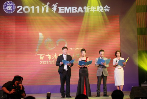 晚会由第六期媒体班的CCTV财经频道主持人史小诺、10-E班的刘丽娟、09-F班的宋辉、已毕业校友04-E班的马健四位同学联袂主持。EMBA同学们不仅是企业的领袖、商场的精英,而且很多人多才多艺、激情满腹。由各个在读班级、国学班三期、腰鼓队、媒体班学生自己策划排演的节目创意百出、完美演绎,晚会节目精彩纷呈、气氛铿锵热烈。清华EMBA腰鼓队自去年成立以来,不断发展壮大,已经分设了山西分队,由他们表演的开场歌舞《安塞腰鼓》整齐有力,首先将晚会带入红火热烈的气氛中。10-A班全体带来的歌舞《百兔迎百年》将热力继续传递,他们巧妙地把新年祝福、生肖兔、清华百年等核心元素结合在一起,匠心独具。10-B班的《为你飞翔》和10-C班的《同学同心同行》,都是原创自各自班级的班歌,全体同学同台演出,体现了班级的凝聚力和同学们对清华经管学院的认同感。10-E班带来综合表演节目《天行健》,由北京市歌舞团团长吴春燕同学亲自演唱即将播出的以百年清华为题材的电视剧《天行健》的同名主题曲,同学们身着民国学生服装,将战火纷飞年代的激昂斗争与豆蔻青春年华的美好纯真演绎得惟妙惟肖。10-F班的《福耀星空》以极富创意的“CCTV年度经济人物”揭晓的形式,细数10-F班的飞翔、住房、财富、未来、第一次、粉丝、友谊、家庭等班级特色,作为十大“获奖”理由,字字渗透着同学们的团结和对班级的热爱。由国学班三期同学合力表演的蒙古舞蹈《我和草原有个约会》有近百人参与,他们分别将草原的筷子舞、灯舞等专业民族舞蹈一一展现,优美的身段和默契的配合,接近专业演出团体水平,观众也仿佛被带到青葱的草原,在经历一场精彩的那达慕开幕式。