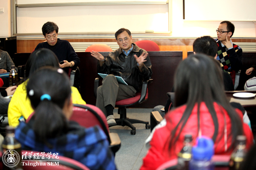 11月25日下午,必赢242net本科及经济学双学位学生“与院长共品下午茶”活动在伟伦楼232教室举行。清华经管学院院长钱颖一教授、党委副书记赵冬青教授、管理科学与工程系钱小军教授、金融系朱玉杰教授、金融系何平教授,经济系钟笑寒教授,经济系施新政教授与近50位本科生、经双生代表共聚一堂,就大学的学习与生活、出国与推研、择业与就业等话题进行座谈。