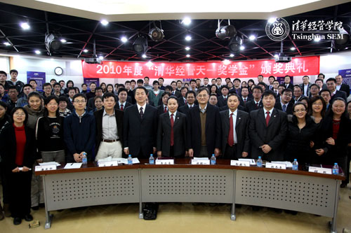 学院党委副书记赵冬青教授和院长助理高建教授分别宣读了本科及MBA的获奖学生名单,钱颖一院长及李兰贞女士亲自为获奖学生颁奖并合影留念。本科生和MBA各委派一名学生代表发表获奖感言,他们在汇报自己学业情况的同时,对天一建设集团的资助表达了感谢之意,对经管学院的培养表达了感激之情,并承诺在以后的学习生活道路中,自律、自强,并以优异的成绩完成学业,用爱心回报社会。