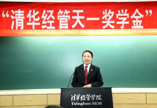李兰贞女士在随后的致辞中表示很高兴来到清华经管学院参加奖学金的颁奖典礼,并代表集团对本次获奖的同学们表达了衷心的祝贺。她说,希望获得奖学金的同学们戒骄戒躁,秉承经管学院“追求完美、行胜于言”的精神,用睿智丈量明天,用厚德载物回馈学校,用成功卓越贡献社会。同时她欢迎同学们到天一建设集团创业、实习,并祝愿清华经管学院教学水平和质量再上新台阶,为国家经济建设培养更多高水平的管理人才。
