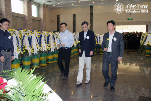 清华经管学院院长钱颖一[中]、党委书记杨斌[左]、国家会计学院(上海)副院长谢荣[右]向陈小悦同志遗体献花