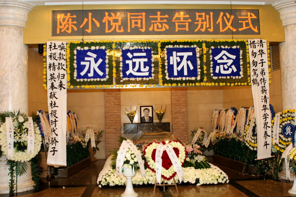 3月21日下午,广州殡仪馆青松厅庄严肃穆,大厅正上方悬挂着“陈小悦同志告别仪式”的横幅,横幅下方是陈小悦同志的遗像。横幅左右两侧的挽联上分别写着“清华子弟传薪清华学界泰斗惜匆匆驾鹤”、“社稷精英奉献社稷时代骄子唤款款归来”的挽联。陈小悦同志生前同事、好友、学生、亲属,以及多家单位及组织的代表近200人参加了告别仪式。