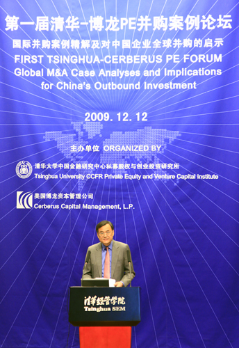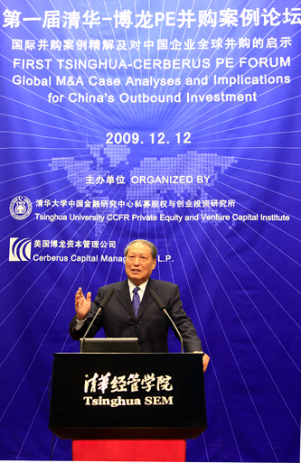 原全国人大常委会副委员长成思危先生在讲话中表示,来参加本次清华-博龙论坛是为了继续他本人近年来在推动私募股权投资的发展方面的持续努力。在这些年的努力之后,他估计关于私募股权投资基金的正式立法应为期不远了。成思危先生的讲话着重强调两个方面。第一,政府和业界要推动中国企业走出去,而私募股权投资的发展应该有利于推动中国企业走出去。研究西方股权投资案例,有利于我们吸收西方的并购经验,让中国企业走出去的战略能够顺利实现。成思危先生指出,近来的全球金融危机从美国开始扩散,已经使得全球经济增长率降为-2.2%。在经过我国政府的积极财政措施之后,中国经济已经开始复苏,而且全球经济复苏的趋向也没有改变。经济复苏的一个迹象是跨国并购的复苏,例如美国最大有线运营商Comcast近期并购NBC环球,宝洁公司并购了吉列公司。