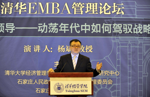 为传播前沿经济管理理念,开拓企业家决策思维,活跃当地经济发展,清华经管学院于2010年1月14日在河北省石家庄市举行了一场主题为“追求卓越的领导——动荡年代中如何驾驭战略与组织”的“清华EMBA管理论坛”。清华经管学院党委书记、清华经管领导力研究中心主任杨斌教授做主题演讲,与河北企业家共同探讨如何掌握卓越领导之道。石家庄市政府副市长刘明轩出席论坛并致辞,清华经管学院EMBA教育中心常务副主任王勇博士主持了该场论坛。来自河北的企业家和高管300余人参加了论坛。