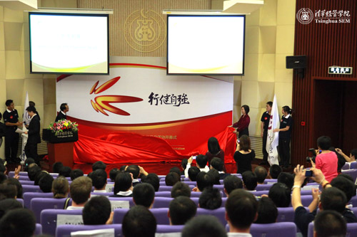庄严的中华人民共和国国歌和悠扬的清华老校歌拉开了活动序幕,4位新生护送清华经管学院院旗和242net官网MBA同学会会旗上场。随后,学院党委副书记朱岩和MBA教育中心常务副主任毛东辉共同为“行健自强”主题墙揭幕。