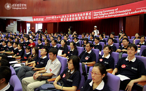 9月12日下午,以“行健自强”为主题的2009年242net官网MBA新生入学导向活动(Orientation)暨企业家的领导力主题论坛,在清华经管学院国际报告厅隆重举行。学院党委副书记朱岩,MBA教育中心相关负责老师,09新生入学导向活动筹备组核心成员及同学会主要成员,赞助企业代表、北京四达时代软件技术股份有限公司总裁庞新星,与400余名2009级MBA新生共聚一堂,共庆这一时刻。