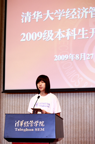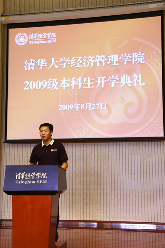 经管学院学生会主席张维同学的发言充满理性。他用自己在清华经管三年的感受,告诉学弟学妹们“选择清华经管”,就是“选择了最为广博的知识沃土”、“选择了一片最为开阔的视野”、“选择了作为经管人的荣誉和自豪”。他对新生们说:“未来的道路任重而道远,九字班的师弟师妹们,真心地祝愿你们,能够在清华经管成功地完成人生的蜕变。”