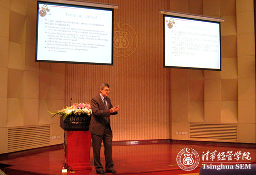 讲座分上午、下午两场,每场两个话题,它们分别是:“风险投资和私人股权投资基金简介”、“私人股权投资基金的表现”、“私人股权投资基金对全球经济的影响”以及“私人股权投资基金对中国的影响”。乔希·勒纳教授的演讲紧密联系美国乃至全球私人股权基金及风险投资的发展现状,并结合自己深入广泛的研究,对私人股权基金的历史、现状及未来作了深入阐述。
