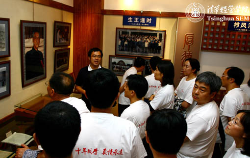 顺着当年报到时的路线,校友们重游清华园。当年的教室、食堂,合过影的二校门,每到一处,无不引起校友们对于那段青春岁月和学子生涯的回忆。谁常迟到,谁最刻苦,谁喜结良缘,谁添丁进口,大家你一言我一语,留下一路欢声笑语。大礼堂前,各种名目的合影――班委、班花、市场营销案例小组、企业战略研讨小组、70后、奔5族,校友们更像是一群刚刚入学的MBA新生,他们的年轻与欢快引得路人时时驻足。