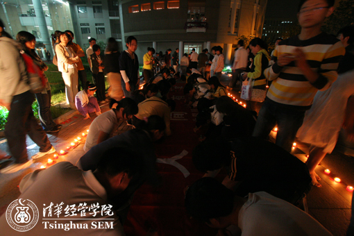 本次活动完全由经管学生自发组织,得到了来自学院的大力支持。同学们在已经通过各种渠道为灾区踊跃捐款的情况下,仍然在当晚捐献了人民币18060元,港币1111元。“接受心灵洗礼、奉献国家和人民从我做起”,成为清华经管全体同学对于烛光祈福及募捐活动的共识。