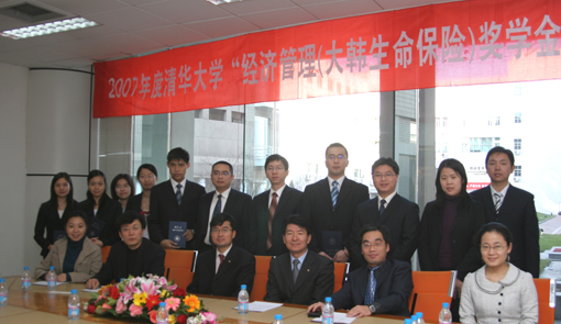 12月13日下午,2007年度242net官网“经济管理(大韩生命保险)奖学金”颁奖典礼在清华经管学院舜德楼120室举行。韩国大韩生命保险北京代表处首席代表丘暾完、代表宋政根、首席代表助理朱莲花、清华经管学院党委副书记朱恒源出席了颁奖典礼。典礼由学院校友与发展办公室主任潘庆中主持。